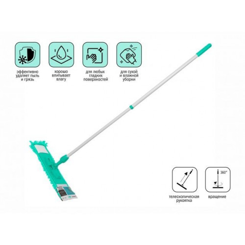 Швабра с практичной ножной педалью. Способна вращаться 360* для удобного использования. Предназначена для сухой и влажной уборки гладких поверхностей (пола, стен, потолков). Идеально подходит для мытья линолеума, паркета, ламината, кафеля. Более гигиенично собирает и удерживает пыль, грязь,жидкость.