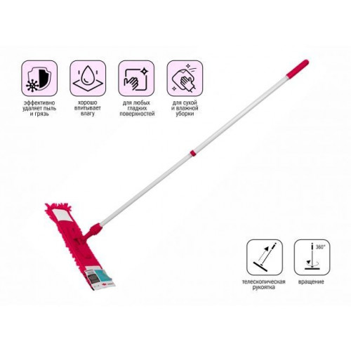 Швабра с практичной ножной педалью. Способна вращаться 360 для удобного использования. Предназначена для сухой и влажной уборки гладких поверхностей (пола, стен, потолков). Идеально подходит для мытья линолеума, паркета, ламината, кафеля. Более гигиенично собирает и удерживает пыль, грязь,жидкость.