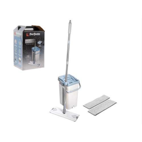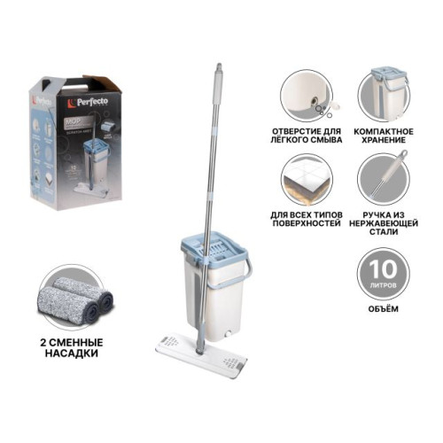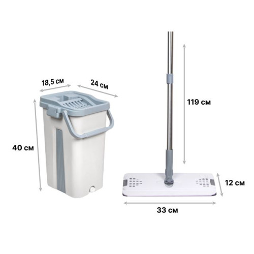 В наборе: отжимное ведро, швабра, 2 сменных насадки из микрофибры.