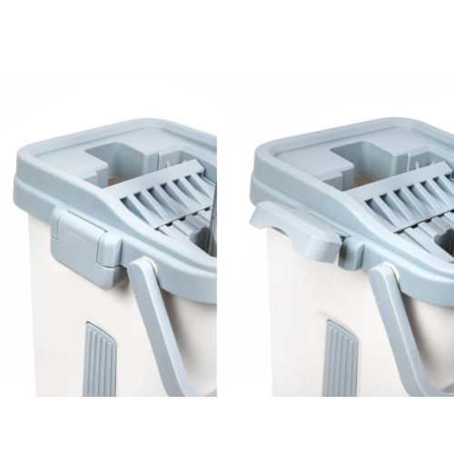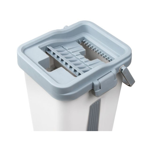 Ведро со шваброй имеет двухкамерное отжимное разделение. Полоскание проводится в одном отделении, во втором – вертикальный самоотжим посредством плотного прижатия от воды. Вращающаяся головка швабры легко достает труднодоступные места. Обеспечивает мойку от пыли любых покрытий, будь то ламинат, кафель, плитка или линолеум.