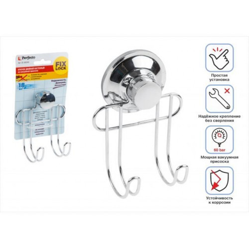 Крючок двойной настенный на вакуумной присоске, хром. сталь, FIX LOCK, PERFECTO LINEA