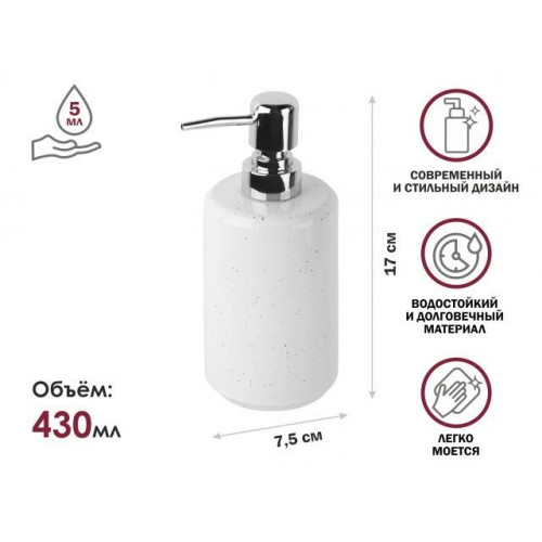 Изысканный дизайн и отделка из керамики придают диспенсеру элегантный и стильный внешний вид, который прекрасно впишется в любой интерьер ванной комнаты. Керамический материал обеспечивает прочность и долговечность диспенсера, что гарантирует его длительное использование без повреждений или износа. Легкость в использовании - диспенсер оснащен удобным механизмом для выдачи жидкого мыла, который позволяет дозировать нужное количество с легкостью и точностью. Легкая очистка - керамическая поверхность диспенсера гладкая и не впитывает грязь, что облегчает его чистку и поддержание гигиены.
