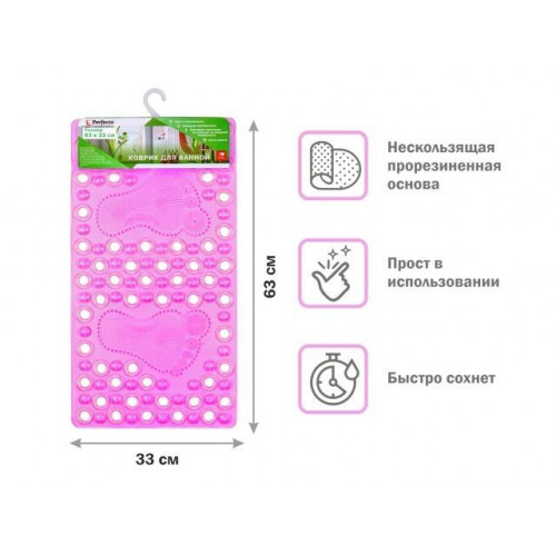 Нескользящая прорезиненная основа предотвращает падение на влажной поверхности. Коврик не выцветает, быстро сохнет. Гигиеничен, так как легко моется.