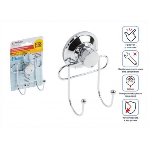 Крючок двойной настенный на вакуумной присоске, хром. сталь, FIX LOCK, PERFECTO LINEA