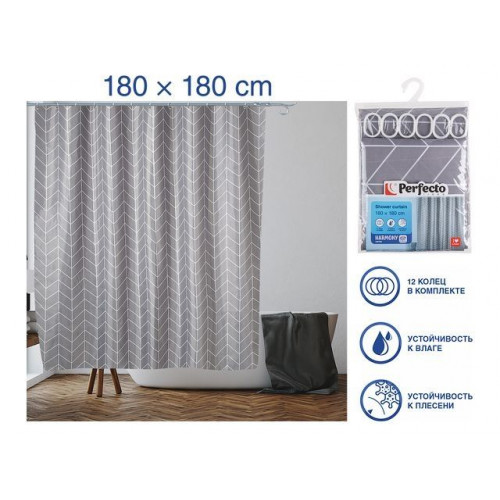 Шторка для ванной (12 колец в комплекте), 180x180 см, Harmony, геометрия, серая, PERFECTO LINEA