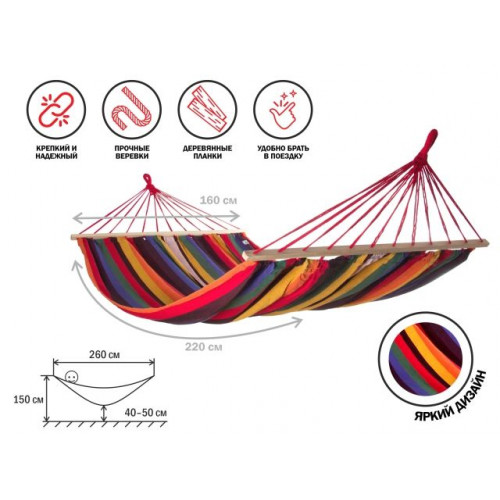 Гамак ARIZONE Garden (28-102120) – это гамак с классической планковой конструкцией. Гамак представляет собой тканевое полотно, прикрепленное при помощи веревок к деревянным планкам. Вся конструкция подвешивается за кольца. Максимальная нагрузка – 200 кг. Материал: хлопок+полиэстр.