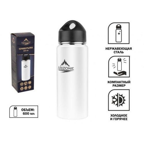 Термобутылка, 600 мл, нержавеющая сталь, белая, ARIZONE