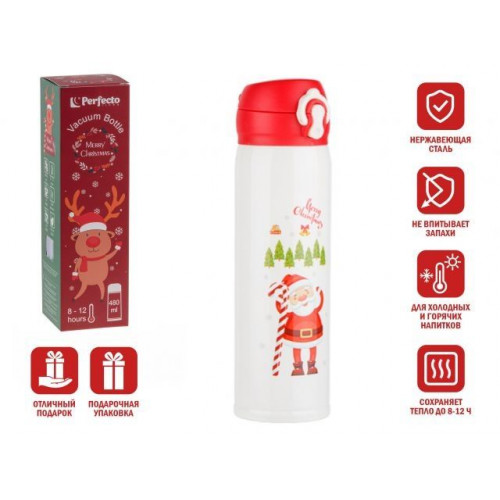 Термос, 480 мл, нержавеющая сталь, MERRY CHRISTMAS, белый, PERFECTO LINEA
